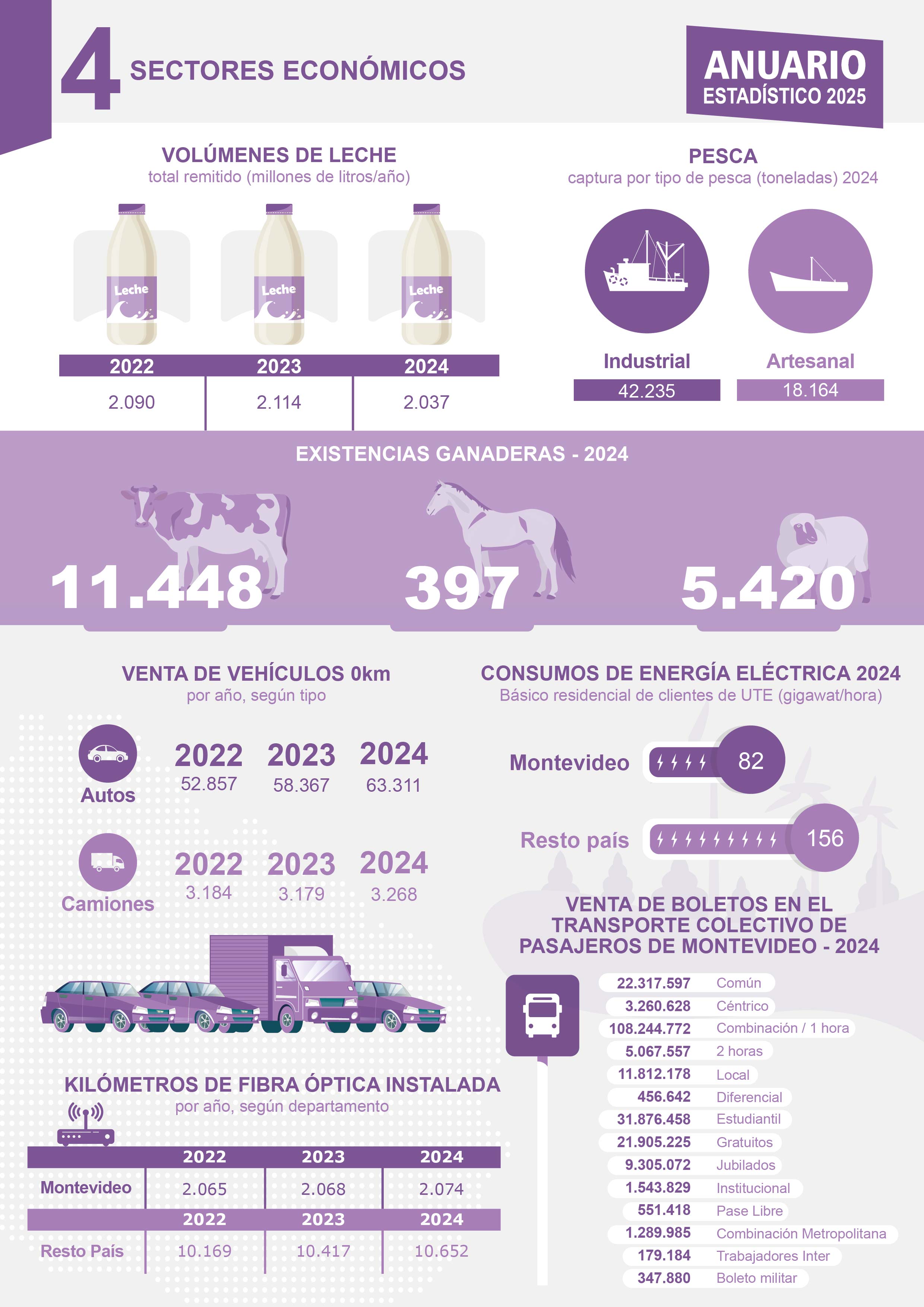 Exponemos datos de transporte con un mapa de la red vial del país actualizado, venta de autos cero kilómetro, cantidad de multas aplicadas, así como carga en toneladas por carretera egresos e ingresos según paso de frontera, pasajeros trasportados en servicios de corta, media y larga distancia y suburbanos. Asimismo presentamos Interesantes datos de parque ferroviario existente, carga y pasajeros. En cuanto a transporte marítimo cantidad de buques entrados a puerto de Montevideo, movimiento de mercaderías operación y modalidad de carga (exportaciones) y descarga (importaciones). En cuanto al transporte aéreo se presentan datos de movimiento de carga en vuelos regulares y movimiento de pasajeros según aeropuerto. En cuanto a estadísticas de comunicaciones presentamos cantidad de terminales telefónicas en servicios, servicios de banda ancha fija con acceso a internet y terminales telefónicas fijas y celulares en servicio, así como kilómetros de fibra óptica instalada por departamento. Por último brindamos estadísticas de turismo que ofrece información sobre turismo receptivo y emisivo. Además, figuran datos sobre turismo interno del país, y turismo tanto receptivo como emisivo según medio de transporte.