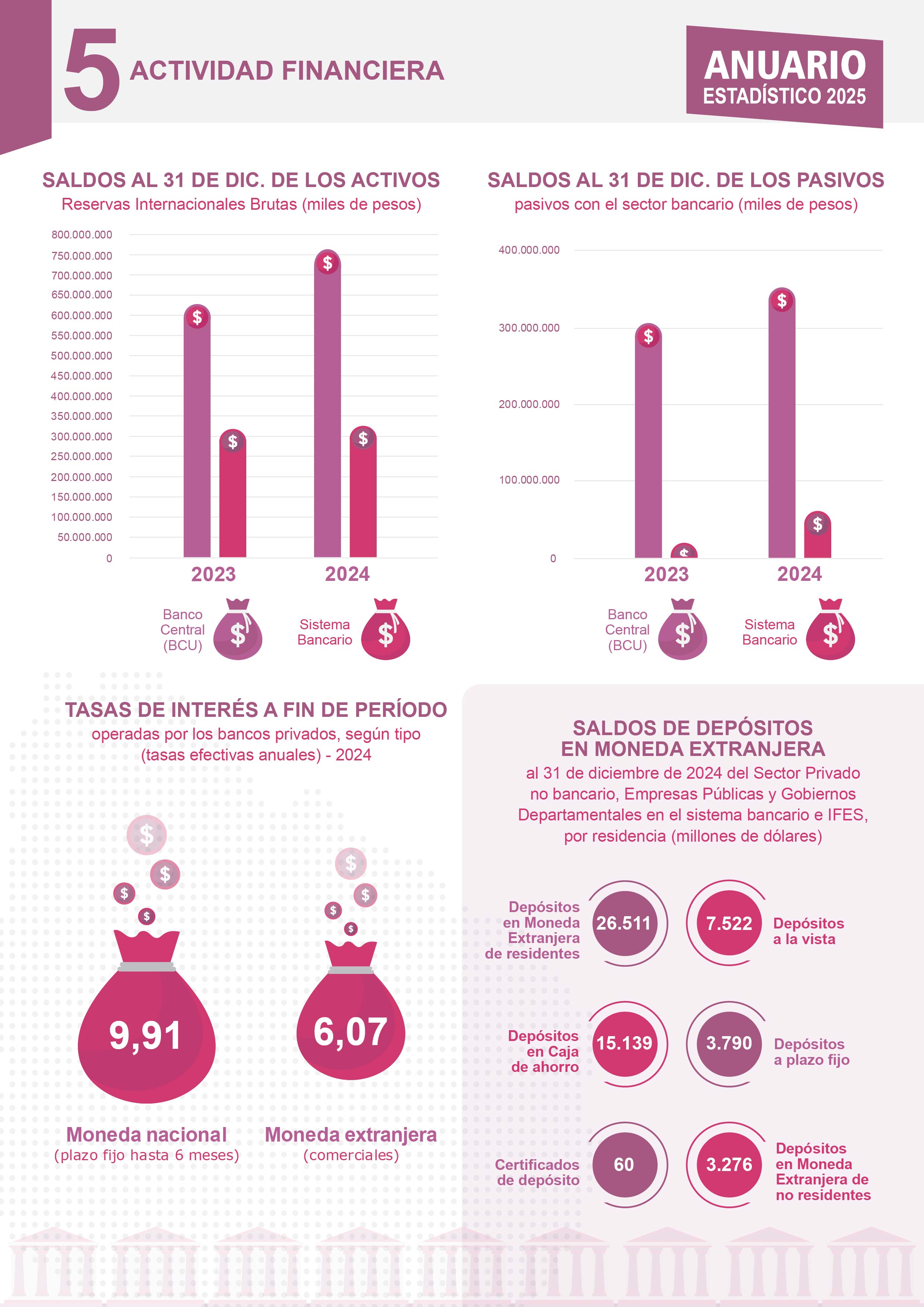 El capítulo 5 presenta datos referentes a la actividad financiera del país, saldos de los depósitos de moneda extranjera y tasas de interés, también presenta datos de seguros importe de las primas e inversiones en activos financieros consolidados y datos del mercado asegurador. Los organismos que intervinieron fueron: Banco Central del Uruguay (BCU) - Superintendencia de Servicios Financieros.