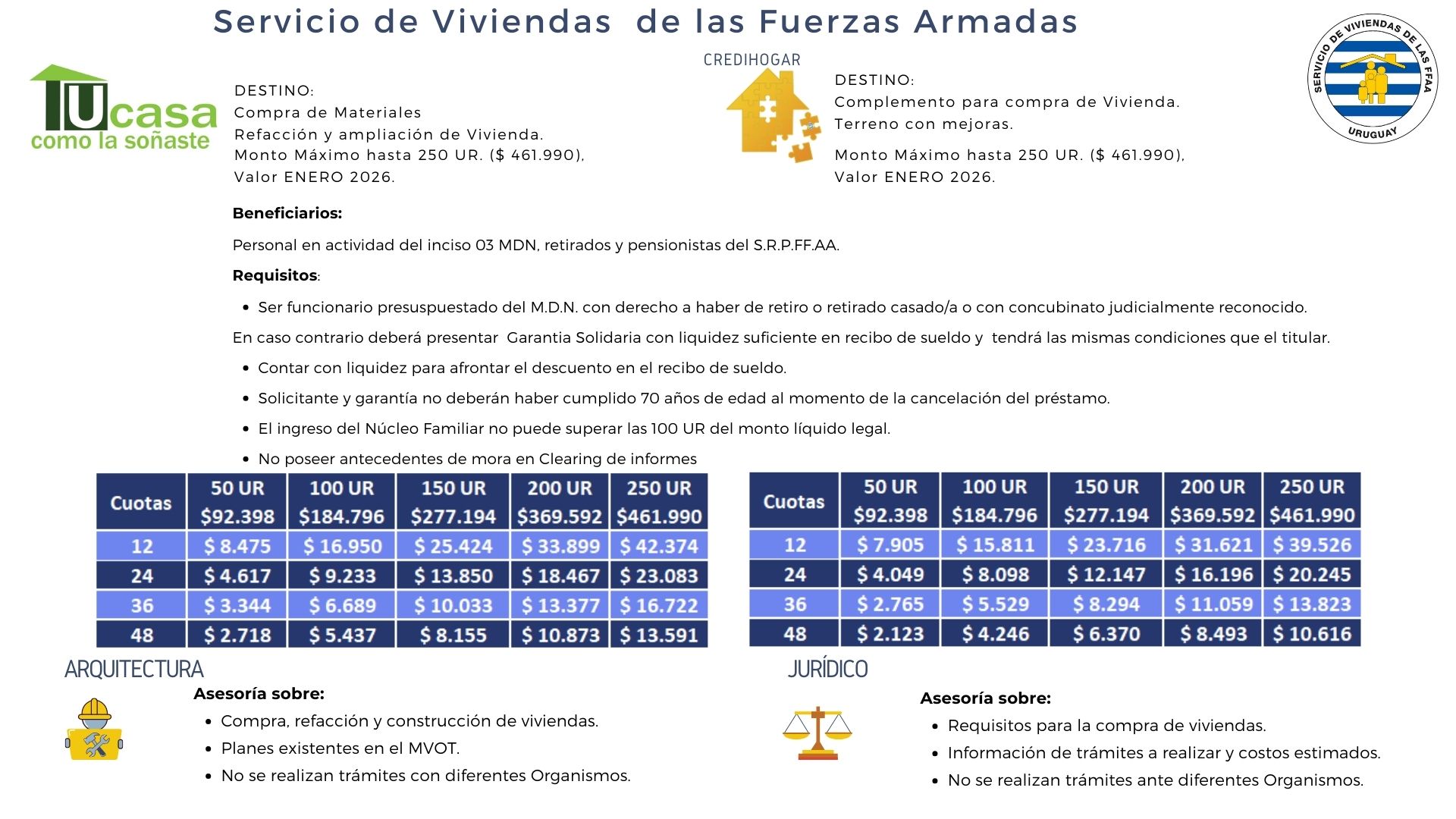 Acorde a la Resolución N°43/20 del 2 de diciembre de 2020 se autoriza al Director del Servicio de Viviendas de las Fuerzas Armadas a tomar en cuenta los requisitos de la línea "Tu casa como la Soñaste", como referencia para el otorgamiento de créditos en la línea «CrediHogar». En especial en lo referente a que el «Ingreso del Núcleo Familiar no puede superar las 100UR del monto líquido legal».