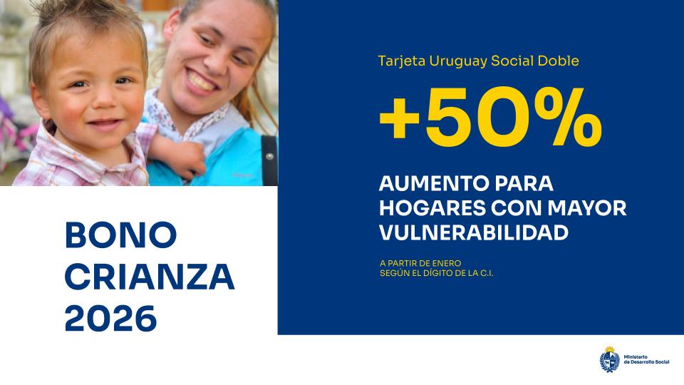 En ese sentido el incremento en los hogares con TUS doble (mayor vulnerabilidad) será de 50% alcanzando $3.339 mensuales por beneficiario a partir de 2026 y los hogares con TUS simple tendrán incremento de 25% del Bono Crianza en 2026 y 2027 ($2.783 mensuales por beneficiario) y de 50% para 2028 y 2029.