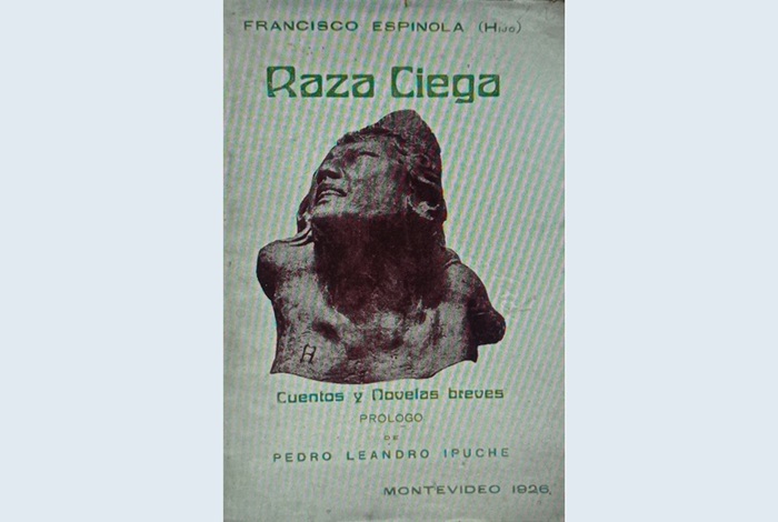 En 1926, con prólogo de Pedro Leandro Ipuche, la editorial La Cruz del Sur publica el primer libro del ‘gaucho’ Espínola como se le conocería. Raza Ciega recibió elogiosas palabras de Jorge Luis Borges y el Premio del Ministerio de Instrucción Pública (1927). La carátula muestra como motivo el busto de un indio. Comenzó a escribirlo en 1922, con veintiún años, en la habitación de una pensión en Montevideo, donde recibía la compañía de sus amigos, Luis Pedro Bonavita y Luis Gil Salguero, con quienes compartía su pasión por la literatura. El volumen de 120 páginas se compone de nueve narraciones, en las que ciertos toques de humor acrecientan por contraste la tragedia que las recorre; por su orden: «El hombre pálido», «Pedro Iglesias», «Yerra», «María del Carmen», «Cosas de la vida», «Visita de Duelo», «El angelito», «Todavía no» y «Lo inefable». Todos son relatos camperos, en un medio social muy primitivo, a excepción del último que, presumiblemente, no iba a integrar el libro.