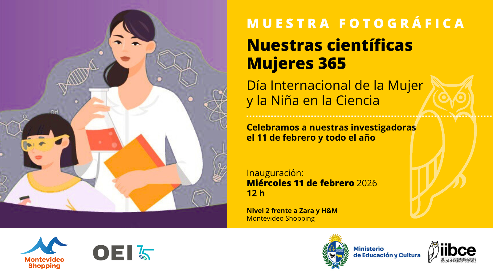 El miércoles 11 de febrero a las 12:00 inauguramos una nueva muestra en el segundo nivel de Montevideo Shopping para homenajear a las científicas.