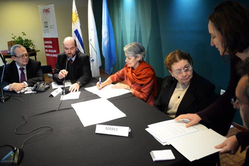 El lunes 27 a las ocho y treinta, en la sala de actos Alba Roballo del noveno piso del MEC, también la subsecretaria Edith Moraes ofició de anfitriona para que la Comisión Nacional de UNESCO se reuniera en forma extraordinaria previo a la firma de un memorandum de entendimiento y recibiera a la directora general Irina Bokova, acompañada del director general adjunto para la comunicación y la información, Frank La Rue, la responsable del escritorio América Latina y el Caribe, Sophia El Akremi y el especialista de programa del despacho de la directora, Kristof Vandenberghe.