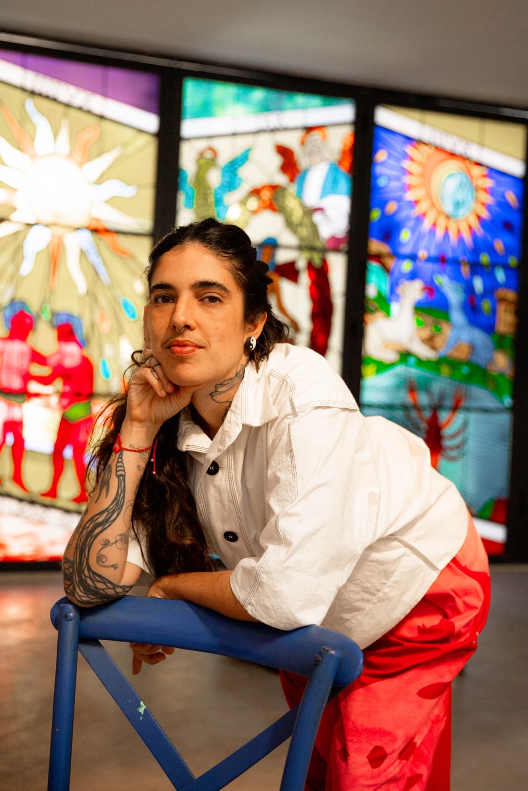 Su obra recupera historias de resistencia del Sur Global, con especial énfasis en luchas lideradas por mujeres y movimientos populares. A través de una estética vibrante, combina pintura, muralismo y objetos para construir contranarrativas al colonialismo y al patriarcado, integrando símbolos históricos, políticos y espirituales. Ver su perfil de Instagram.