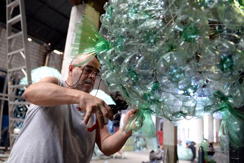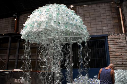 Unas 15.000 botellas y bidones de plástico fueron necesarios para lograr la representación de la fauna marina autóctona que incluye medusas y peces gigantes. Cada una insume entre 450 y 500 botellas y requiere de cuatro días para terminarla. “Se trató de que fuera algo vistoso pero más o menos rápido de hacer”, cuenta Hirigoyen.