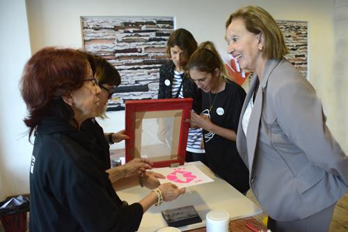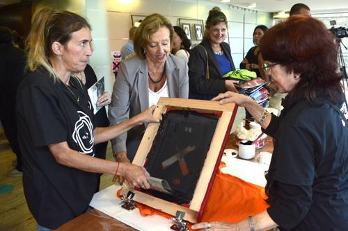 Silvana y Carla le muestran la técnica de la serigrafía a la ministra María Julia Muñoz