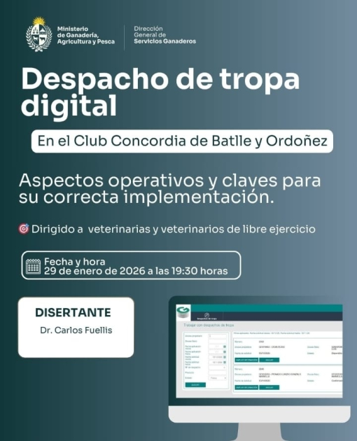 El jueves 29 de enero a las 19:30 horas se realizará una charla técnica sobre despacho de tropa digital en el Club Concordia de Batller y Ordoñez. La actividad estará a cargo de Carlos Fuellis, y abordará los principales aspectos operativos del sistema, requisitos y buenas prácticas para productores y veterinarios.