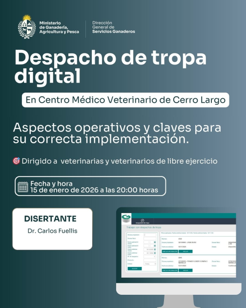 El jueves 15 de enero a las 20:00 horas se realizará una charla técnica sobre despacho de tropa electrónico en el Centro Médico Veterinario de Cerro Largo. La actividad estará a cargo de Carlos Fuellis, y abordará los principales aspectos operativos del sistema, requisitos y buenas prácticas para productores y veterinarios.