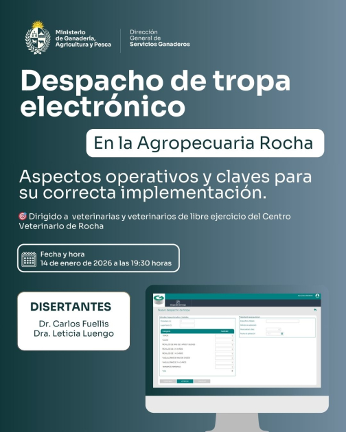 El miércoles 14 de enero a las 19:30 horas se realizará una charla técnica sobre despacho de tropa electrónico en Agropecuaria Rocha. La actividad estará a cargo de Carlos Fuellis y Leticia Luengo, y abordará los principales aspectos operativos del sistema, requisitos y buenas prácticas para productores y veterinarios.