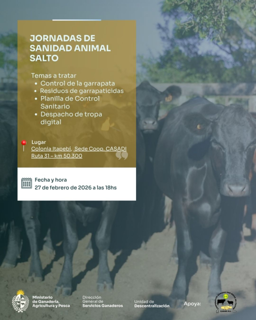El Ministerio de Ganadería, Agricultura y Pesca (MGAP), a través de la Dirección General de Servicios Ganaderos, junto a la Cooperativa Agraria San Diego (CASADI), realizará una jornada de intercambio y actualización en sanidad animal en el departamento de Salto.