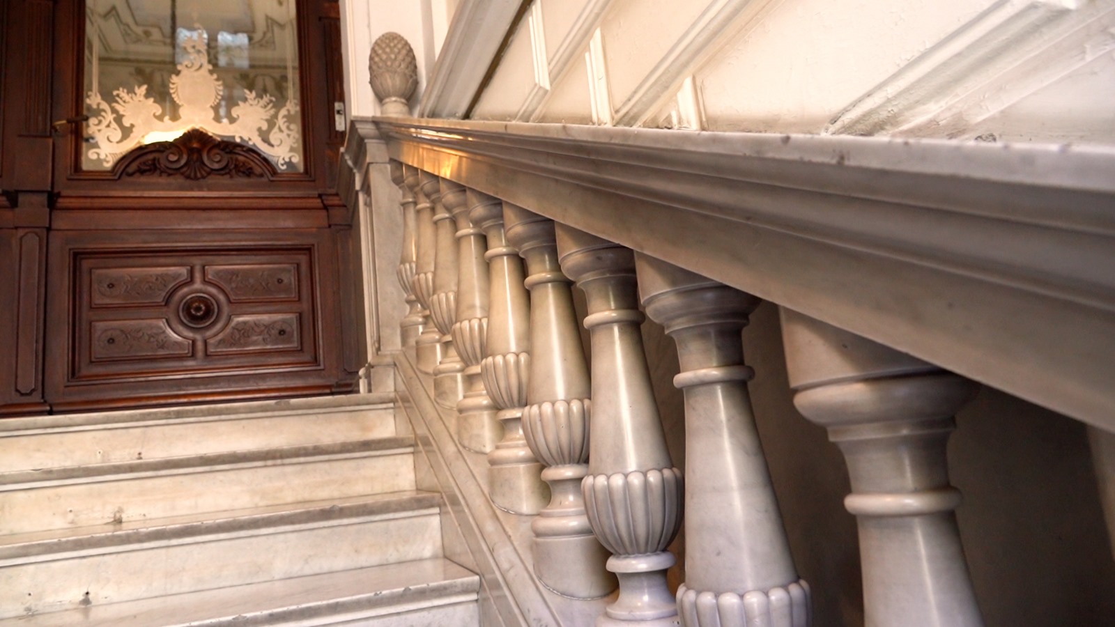 • Escalera de acceso: Puertas de madera macizas trabajadas y puertas con vidrios decorados. Mármol de Carrara en escalones, barandas y decoración. Ángeles, ánforas, jarrones y piñas como símbolos de abundancia.