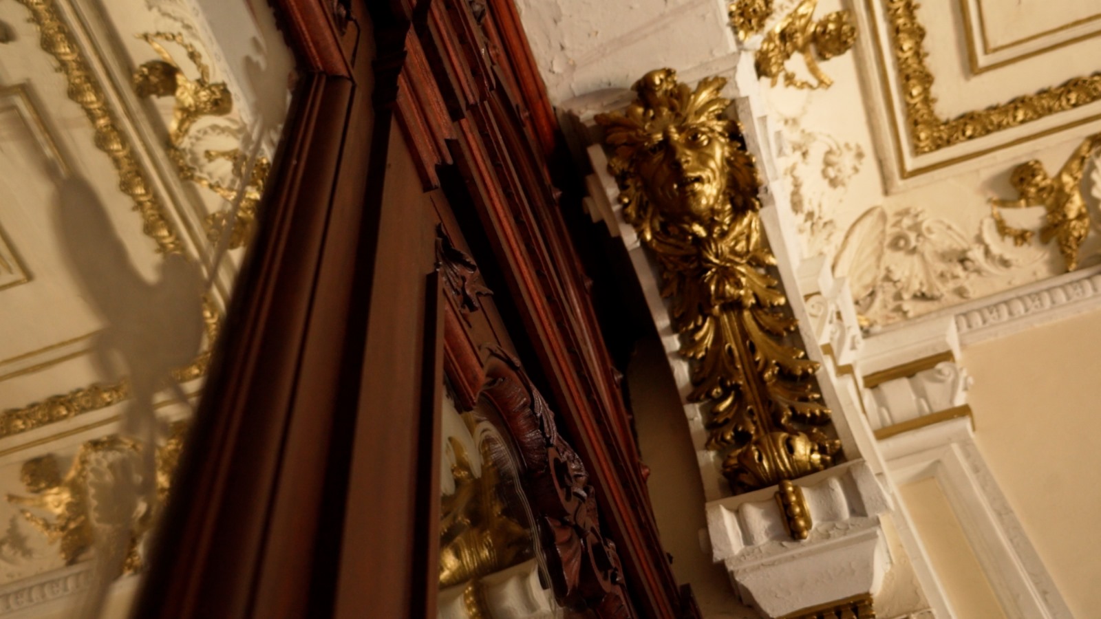 • Hall principal con claraboya decorada, pisos de mármol blanco y frescos naturalistas, restaurados recientemente. En paredes y cielorrasos, decoraciones de molduras, flores y ángeles en dorado a la hoja. Se repite decoración de ánforas y piñas.