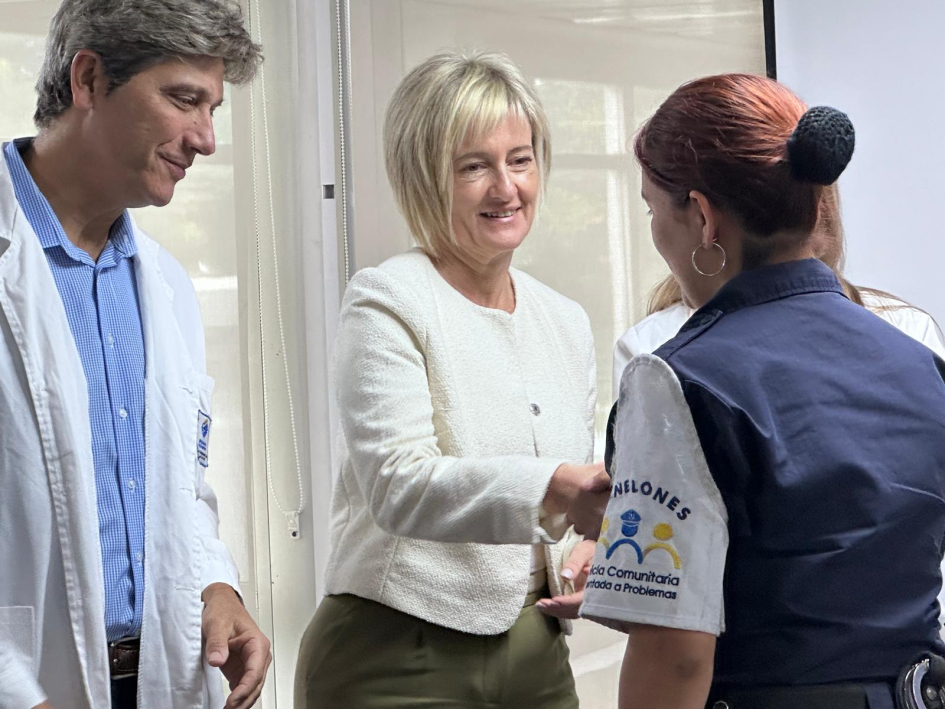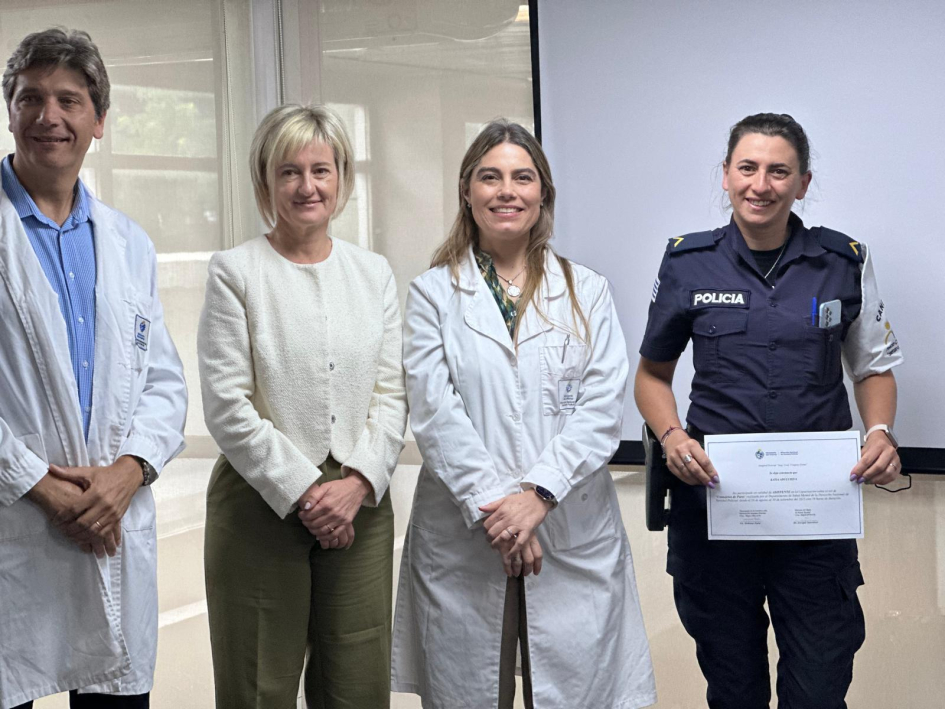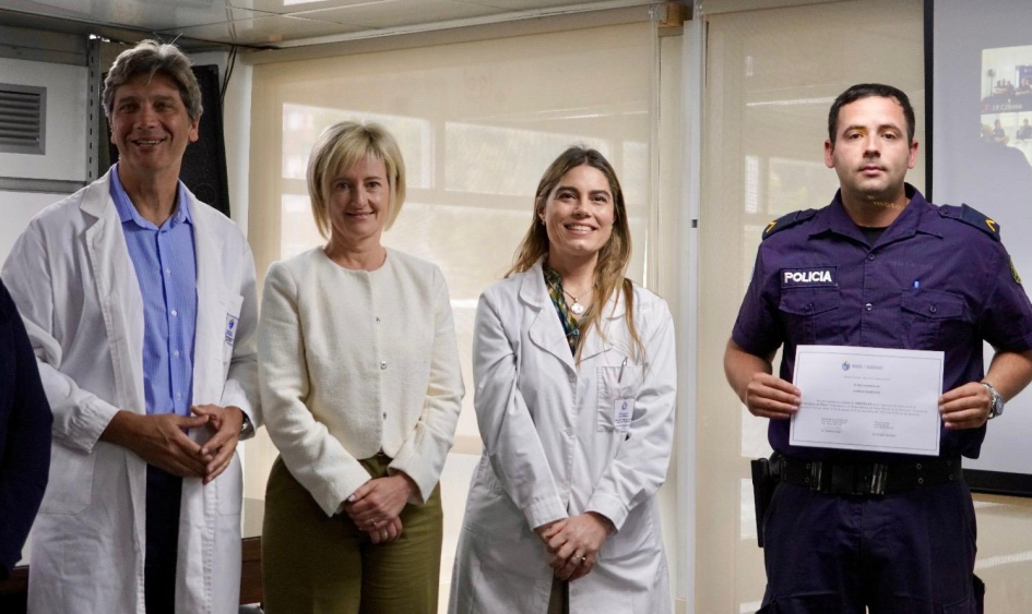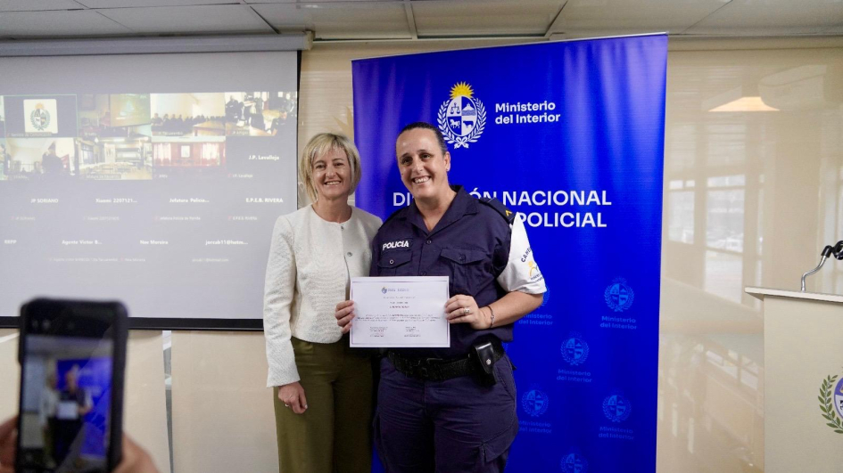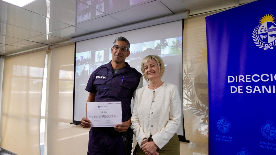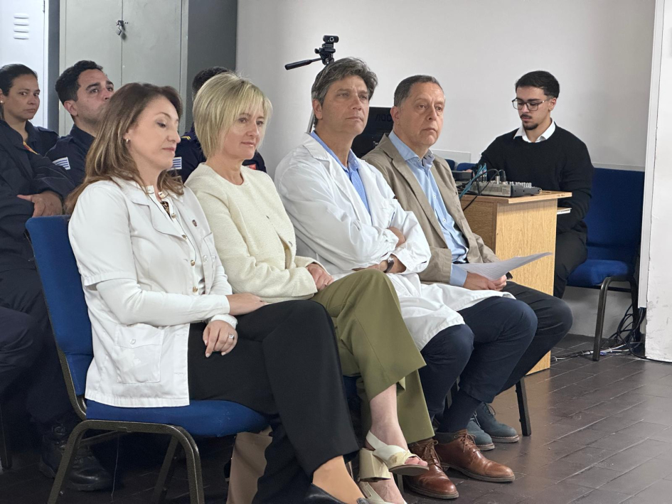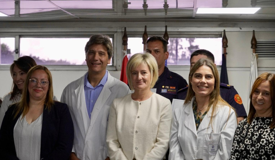 De la ceremonia de entrega en Montevideo, junto con la Subsecretaria del Ministerio del Interior, Cra. Gabriela Valverde, participaron el Encargado de la Dirección Nacional de Sanidad Policial, Comisario Mayor (PT) (CP) Dr. Julio César Rappa Anido, la Encargada de la Subdirección Nacional de Sanidad Policial, Comisario Mayor (PT) (CP) Lic. Dahiana Evelyn Farto Blanco, Directora Técnica de Hospital Policial, Comisario Mayor (PT) (CP) Dra. Verónica Pérez, el Director del Departamento de Salud Mental de Sanidad Policial, Comisario Mayor (PT) (CP) Dr. Enrique Smerdiner y la Coordinadora de la Unidad de Estrés, Comisario Mayor (PA) Lic. en Psicología Karina Cuitiño.
