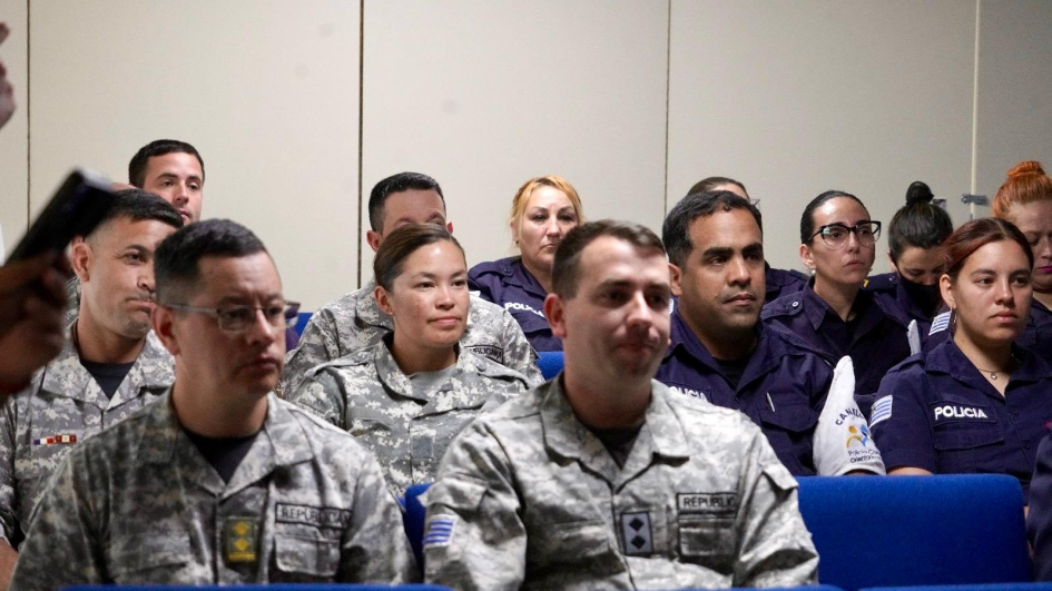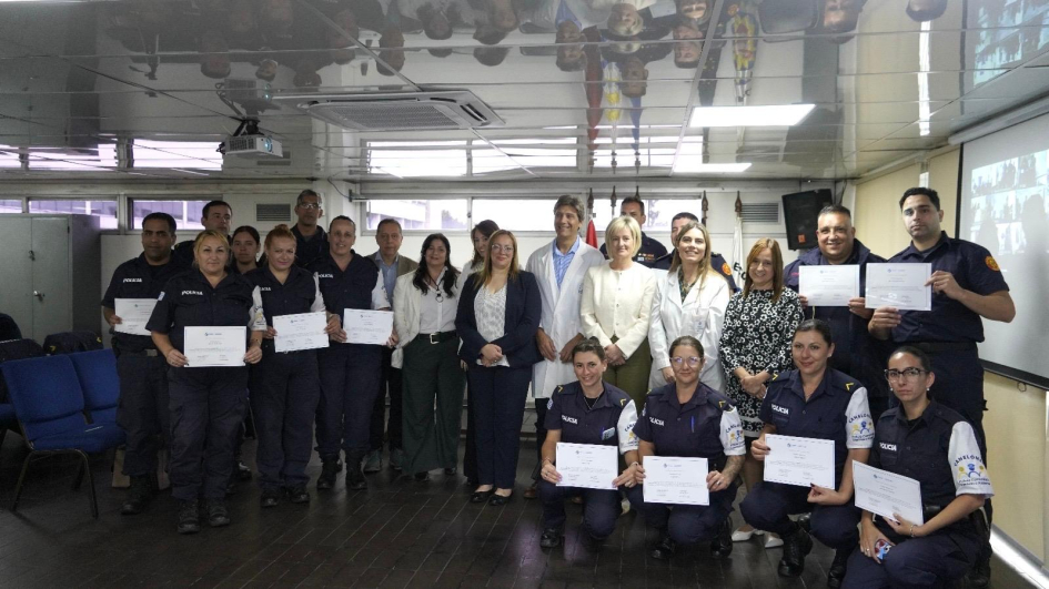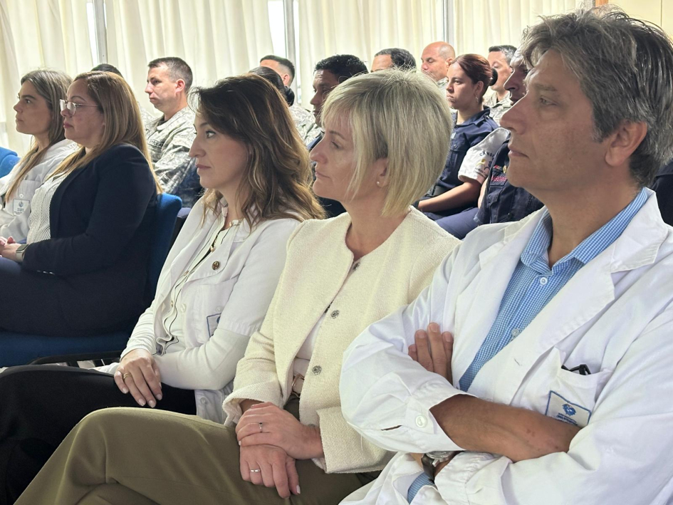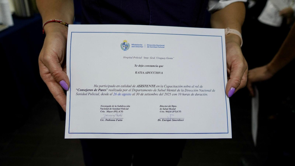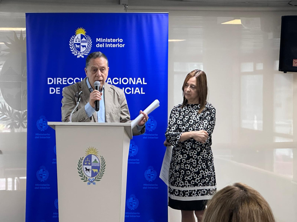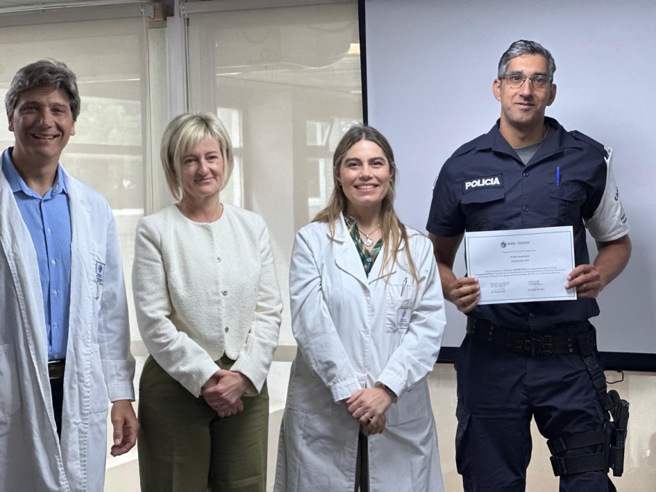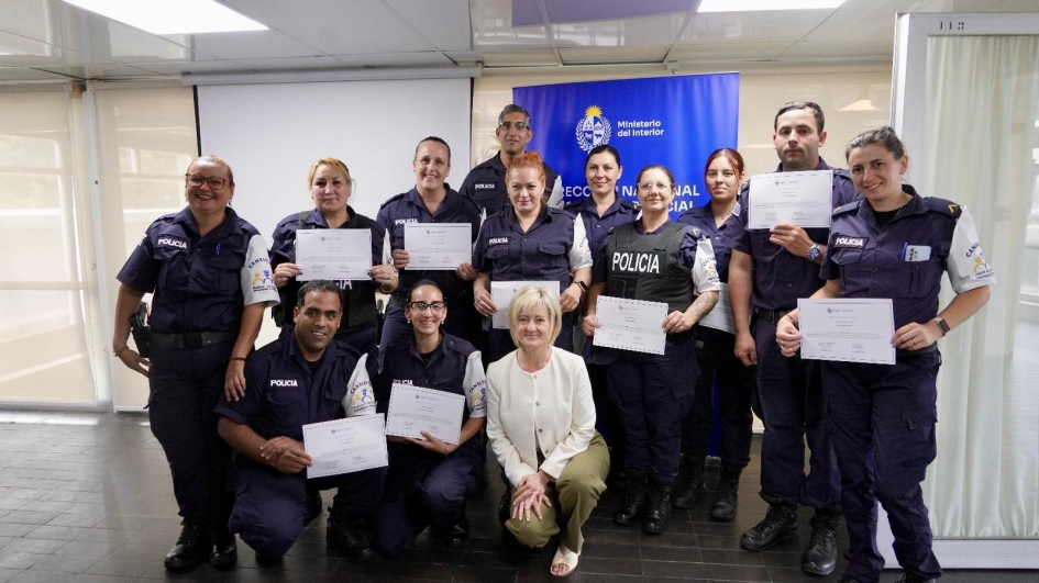 De la ceremonia de entrega en Montevideo, junto con la Subsecretaria del Ministerio del Interior, Cra. Gabriela Valverde, participaron el Encargado de la Dirección Nacional de Sanidad Policial, Comisario Mayor (PT) (CP) Dr. Julio César Rappa Anido, la Encargada de la Subdirección Nacional de Sanidad Policial, Comisario Mayor (PT) (CP) Lic. Dahiana Evelyn Farto Blanco, Directora Técnica de Hospital Policial, Comisario Mayor (PT) (CP) Dra. Verónica Pérez, el Director del Departamento de Salud Mental de Sanidad Policial, Comisario Mayor (PT) (CP) Dr. Enrique Smerdiner y la Coordinadora de la Unidad de Estrés, Comisario Mayor (PA) Lic. en Psicología Karina Cuitiño.