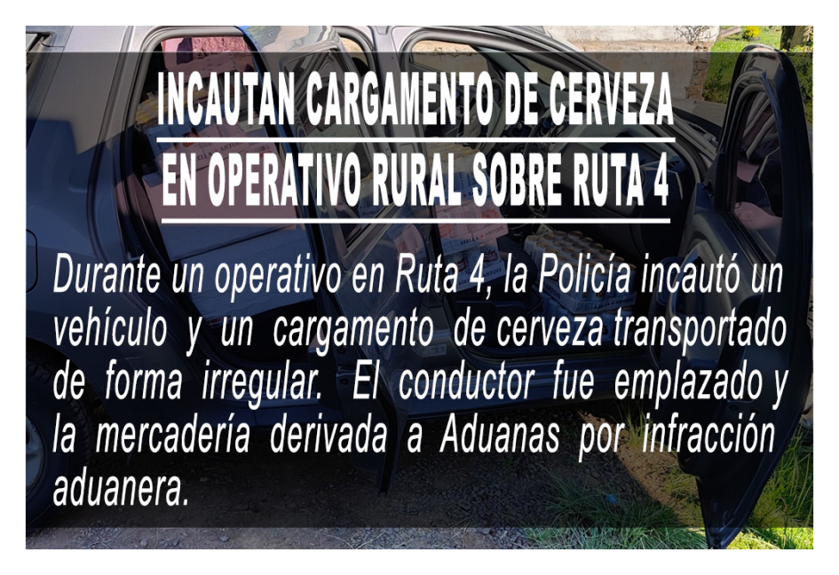 El hecho ocurrió a la altura del kilómetro 190 de la Ruta 4, donde los funcionarios policiales interceptaron un vehículo que circulaba de forma sospechosa. Tras la inspección del rodado, se constató que en la carrocería eran transportados, de manera oculta, 53 fardos de cerveza, cada uno conteniendo 24 unidades.
