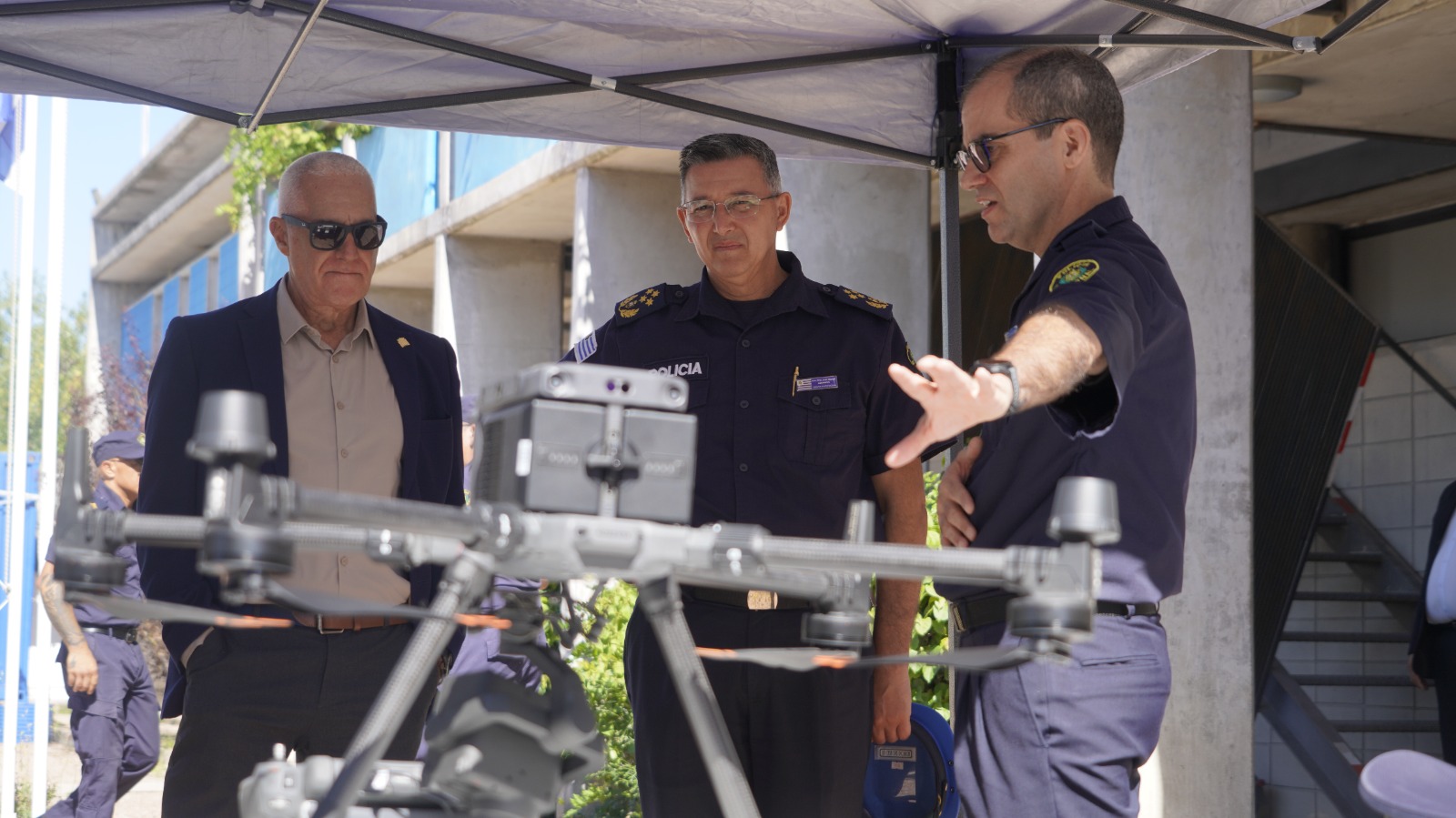 De la demostración participó el Ministro del Interior, Dr. Carlos Negro; el Director de la Policía Nacional, Comisario General (R) José Manuel Azambuya; el Subdirector Nacional de la Guardia Republicana, Comandante Mayor Gabriel Silvera; el Director General del Centro de Comando Unificado Comisario Mayor Lic. Víctor Torres, junto a su Subdirector, Comisario Mayor Fernando Maneiro.