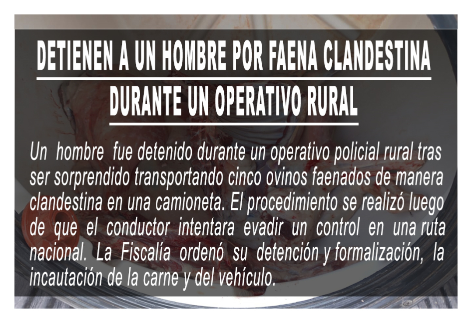 La intervención se originó a partir de información que alertaba sobre el posible traslado hacia la ciudad de carne proveniente de una faena ilegal. Ante esta situación, los efectivos montaron un puesto de observación y control sobre una ruta nacional.
