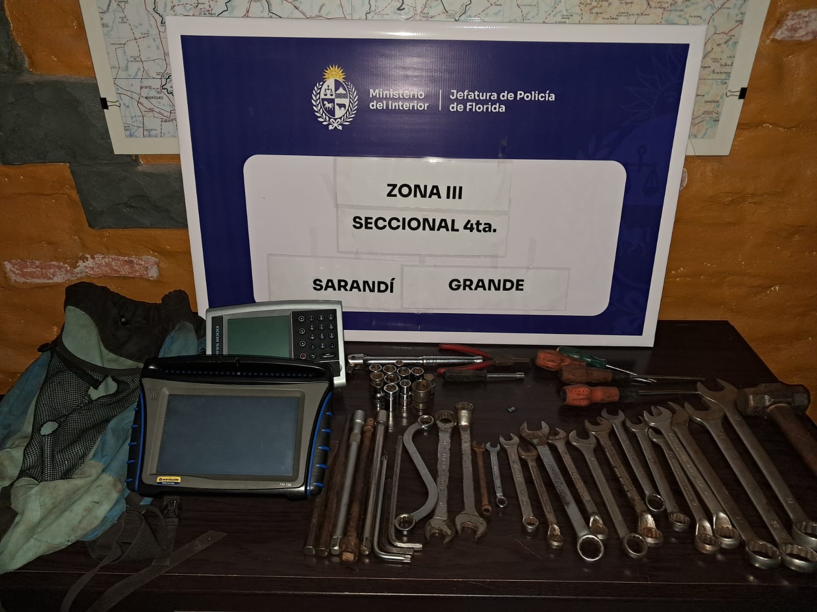 El pasado 11 de los corrientes, en Seccional 4.ª de Sarandí Grande, un hombre de 47 años radicó denuncia por el hurto de un banderillero satelital, pantalla monitor de rendimiento correspondiente a una maquinaria agrícola y herramientas varias; que se encontraban en campos de un establecimiento rural de la zona, avaluándose lo hurtado en unos 20.000 dólares americanos.