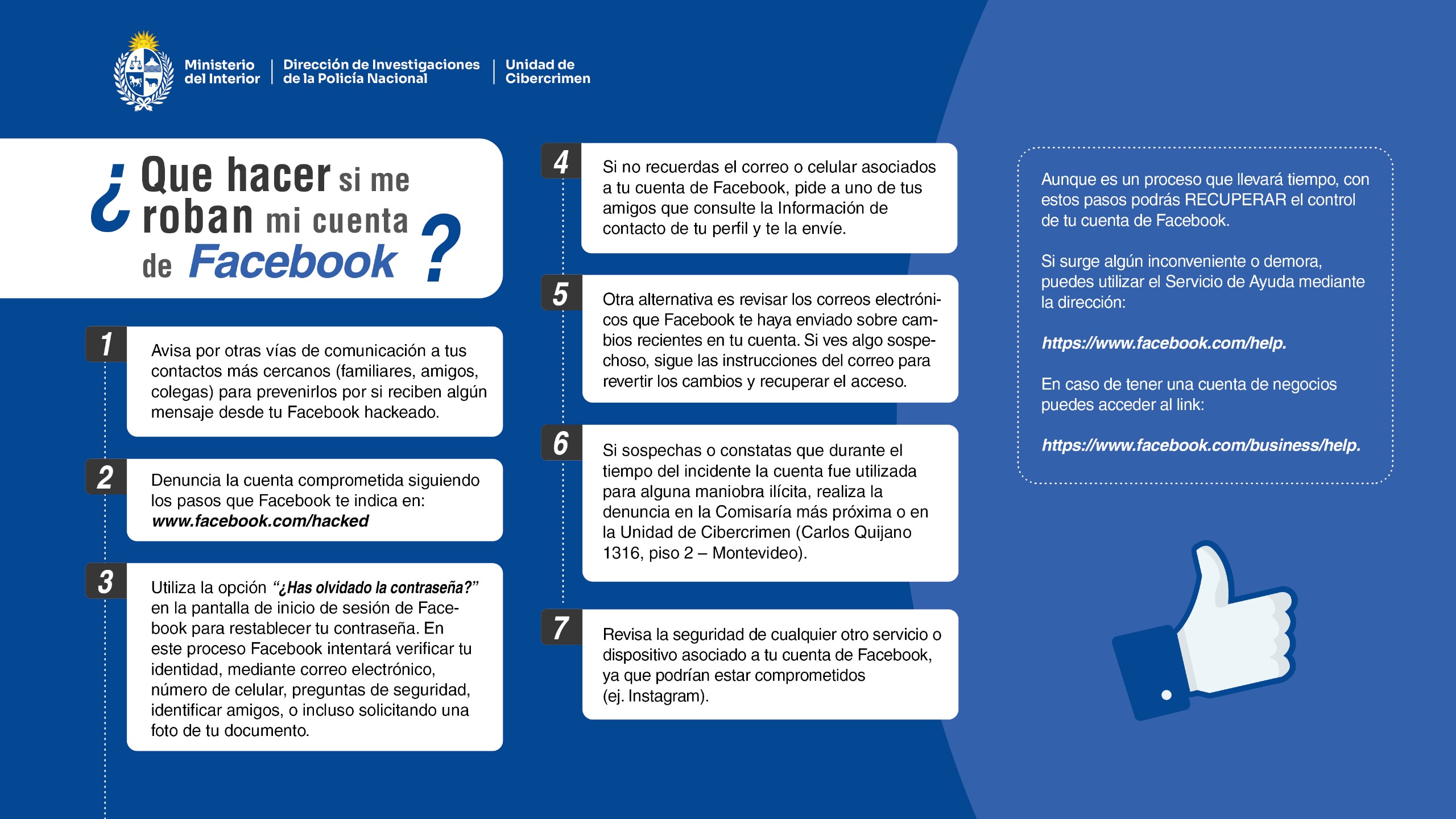 Si sospechas o constatas que durante el tiempo del incidente la cuenta fue utilizada para alguna maniobra ilícita, realiza la denuncia en la Comisaría más próxima o en la Dirección General de Cibercrimen (Carlos Quijano 1316, piso 2 – Montevideo).