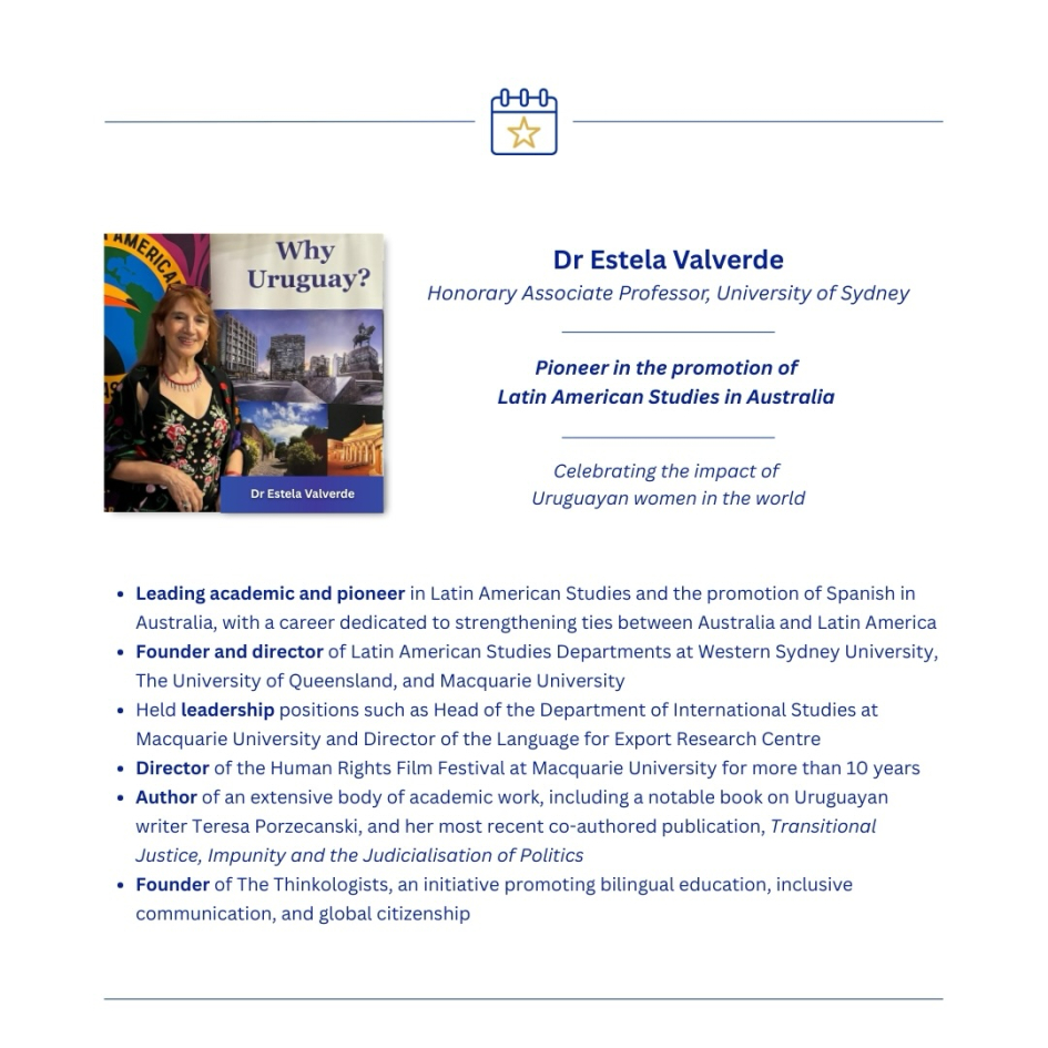 Today, we highlight Dr Estela Valverde, a pioneer of Latin American Studies in Australia, whose distinguished career reflects the talent, vision and global impact of Uruguayan women.