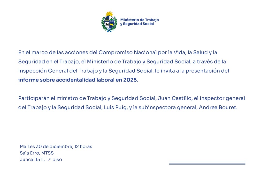 Informe sobre accidentalidad laboral en 2025 Compartir Facebook X Copiar enlace WhatsApp LinkedIn202530Dic30 de Dic del 202512:00Sala Erro, Juncal 1511, 1° piso