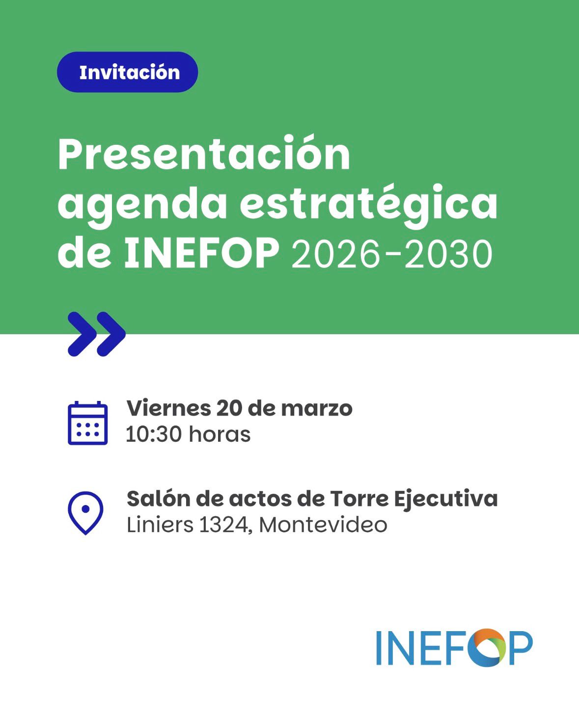 Presentación agenda estratégica de INEFOP 2026-2030 Compartir Facebook X Copiar enlace WhatsApp LinkedIn202620Mar20 de Mar del 202610:30Salón de actos de Torres Ejecutiva