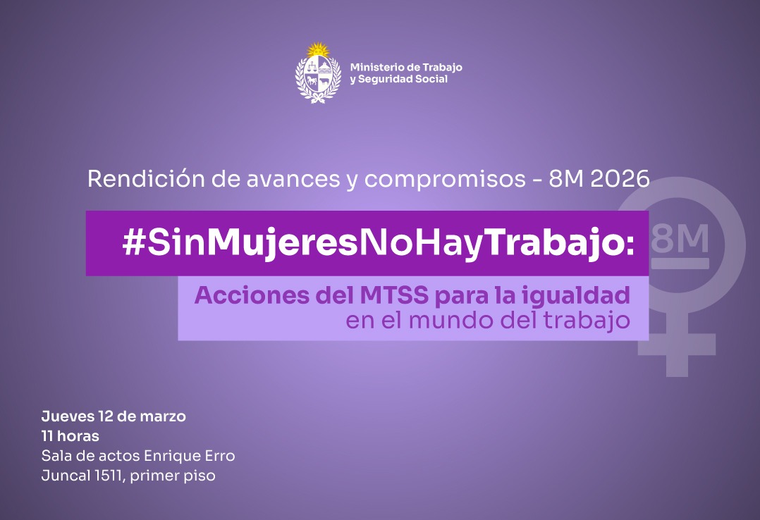 Rendición de avances y compromisos 8M 2026 Compartir Facebook X Copiar enlace WhatsApp LinkedIn202612Mar12 de Mar del 202611:00Sala de actos Enrique Erro, Juncal 1511, primer piso Etiquetas Empresas Personas Sindicatos