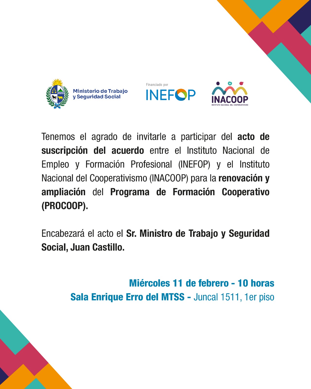 Suscripción de acuerdo PROCOOP INEFOP INACOOP Compartir Facebook X Copiar enlace WhatsApp LinkedIn202611Feb11 de Feb del 202610:00Sala Enrique Erro, Juncal 1511, 1° piso Etiquetas Empresas Personas Sindicatos