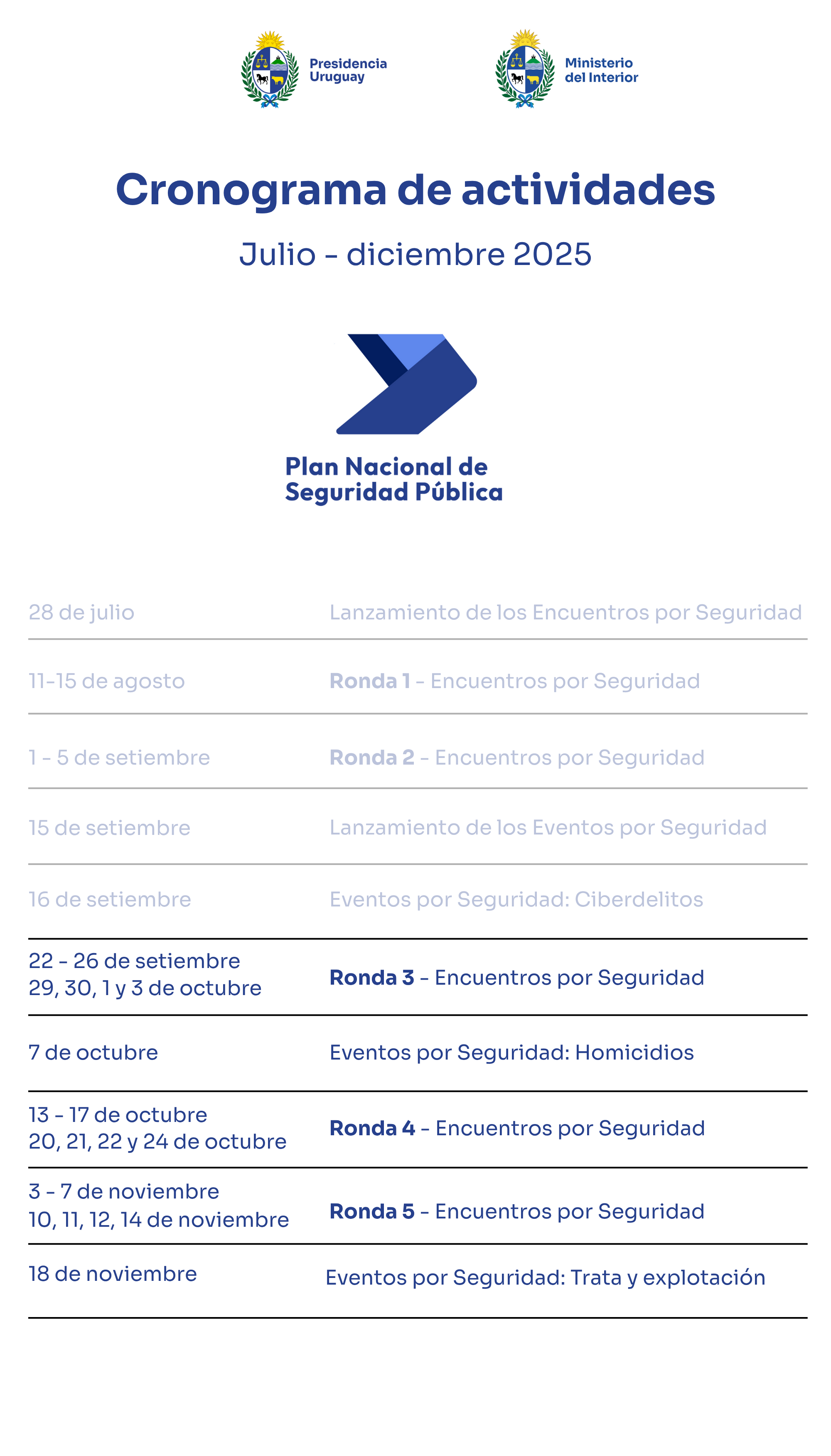 Cronograma completo Actividades julio - diciembre 2025 Informes 18/11/2025 Compartir Facebook X Copiar enlace WhatsApp LinkedIn Cronograma completo de actividades correspondiente a la Fase 2 del Plan Nacional de Seguridad Pública.
