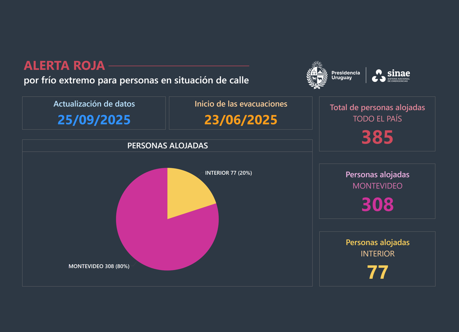 - 385 en los Centros de Evacuación (308 en Montevideo y 77 en el interior).